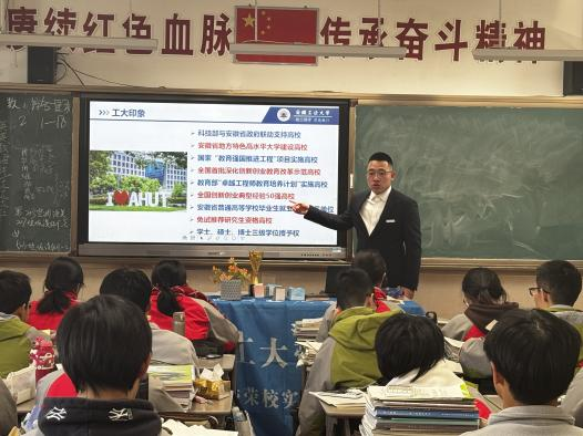 “我把工大带回家乡”百支爱校荣校实践团上海分队赴上海市华东理工大学附属曙光中学进行宣讲,宣讲团成员徐羿、王钟伟参加宣讲。