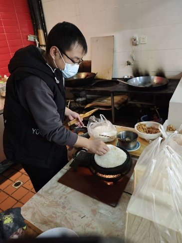 在山西长治市,实践队员向师傅们学习长治特色美食驴肉甩饼的制作工艺。驴肉甩饼的每一个制作步骤都需要工匠精湛的手艺和耐心细致的操作,它承载着当地人民对传统文化的珍视和传承。在享受美味的同时,实践队员希望让更多的人了解、喜爱并传承中华饮食文化的精髓。
