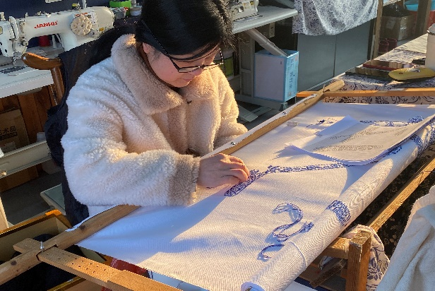 在安徽望江县,实践队员来到望江挑花保护与传承基地,一幅幅清新古朴的挑花艺术作品映入眼帘,令人叹为观止。望江挑花以青白相间的色调、清晰透白的质地,以及表里如一的品质,彰显了其清正、清廉的文化内涵,使队员们感受这项非遗技艺所承载的历史重量与文化价值。
