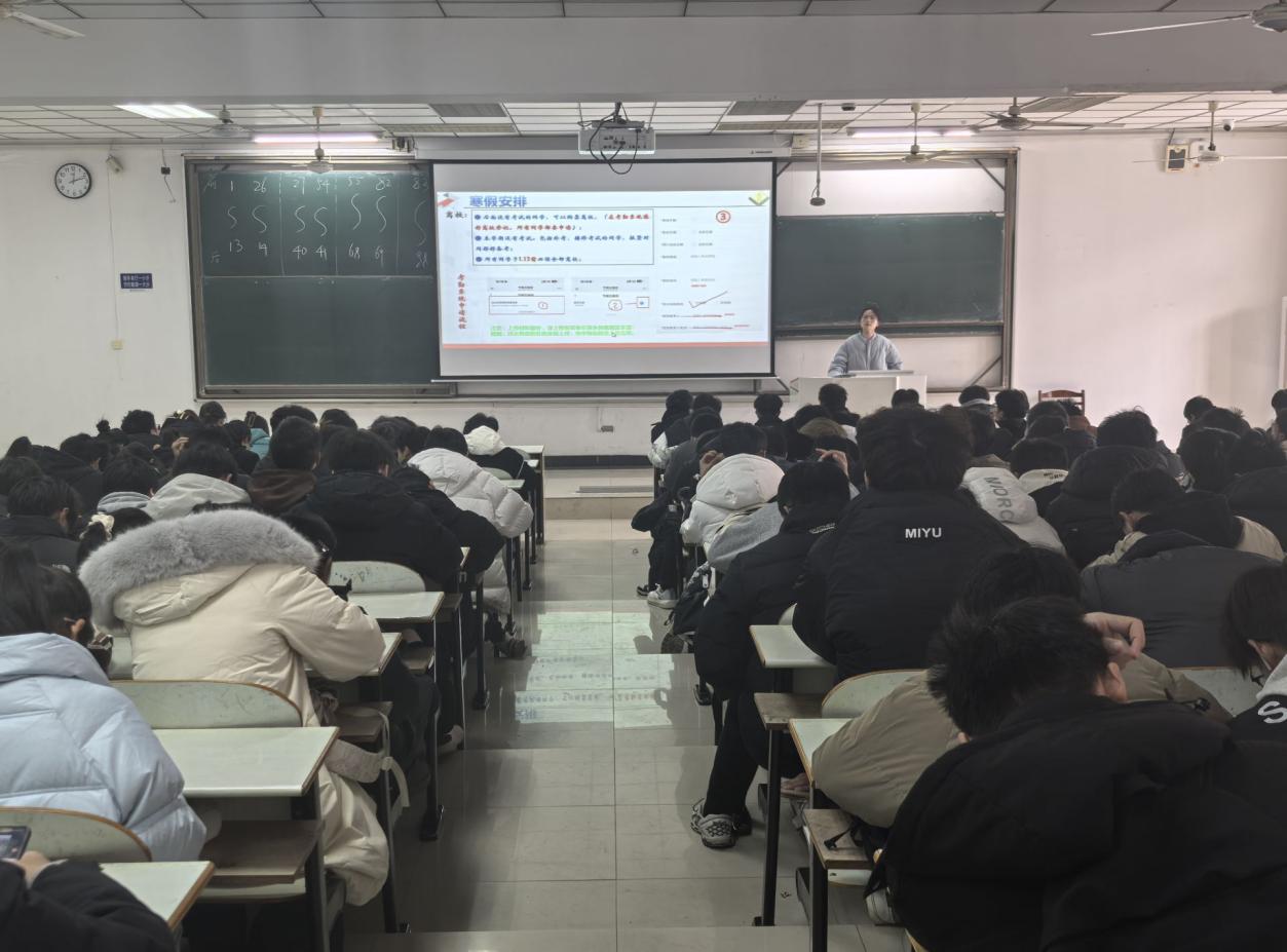 于佳山校区教三南201、301教室召开2024级本科生年级会暨寒假安全教育会。会议由2024级辅导员王倩、孙晨共同主持,2024级全体本科生参加了会议。