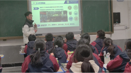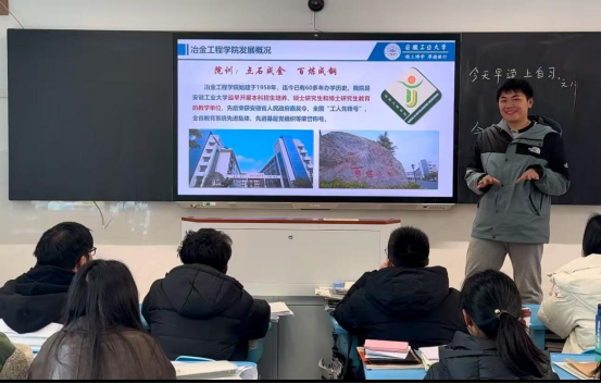“我把工大带回家乡”百支爱校荣校实践团六安分队赴六安市毛坦厂中学进行宣讲。宣讲团成员张友志同学结合自身在工大的学习生活体验,讲述了成长故事,为同学们播放了宣传视频,激起了同学们浓厚的兴趣。
