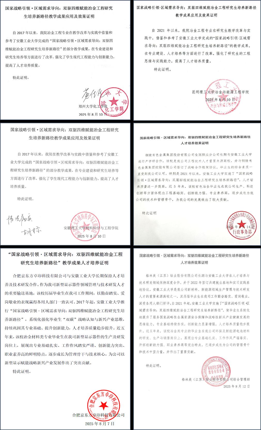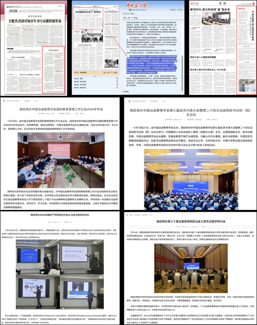 在校内外进行公开课及教学交流活动10余次,相关创新理念及教改举措引发广泛讨论与反响,先后被《中国教育报》、《光明教育家》、《科技日报》、《安徽青年报》等媒体报道宣传(图10)。目前该成果已在郑州大学、昆明理工大学、安徽理工大学等高校得到实际应用,受到铜陵有色、京东方、格林美等龙头企业高度认可(图11)。