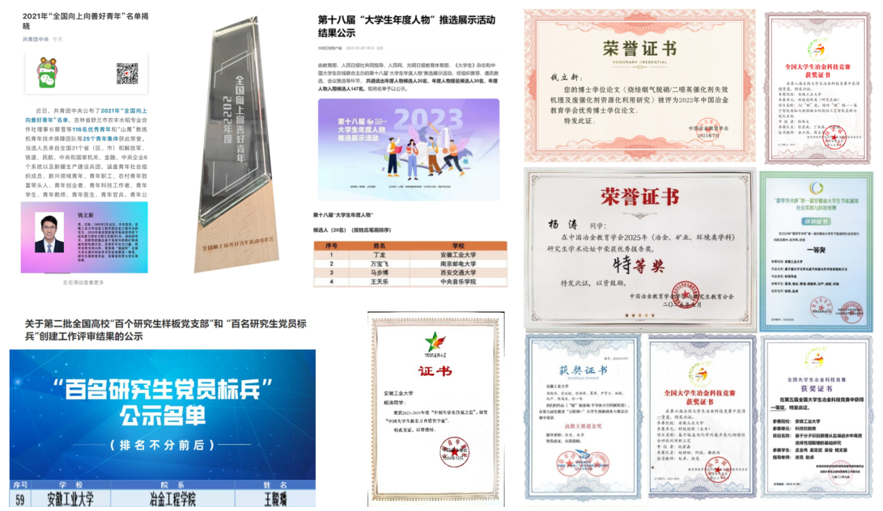 1区论文63篇,授权国家发明专利45项,在挑战杯、中国国际大学生创新大赛、节能减排大赛、大学生冶金科技竞赛等赛事中获得国家级特等奖/一等奖20余项(图8)。