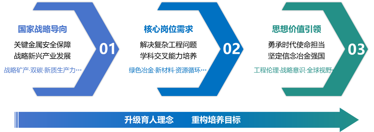 基于国家战略需求,实现育人理念与培养目标升级(图3)。一是系统调研国家战略导向(如战略性矿产清单、“双碳”目标、新质生产力)与领军企业人才需求,将服务国家战略关键金属安全保障与战略新兴产业发展作为核心定位。二是要求毕业生掌握深厚专业知识的同时,具备解决复杂工程问题能力和多学科融合素养,确保其知识结构与能力素养精准匹配战略领域核心岗位(如关键金属绿色提取、新能源材料研发、资源循环利用)要求,实现人才培养从学科范畴向国家战略需求驱动的根本转变。三是在培养研究生家国情怀、使命担当、工程伦理的基础上,进一步开展价值引领,提升战略意识与全球视野。
