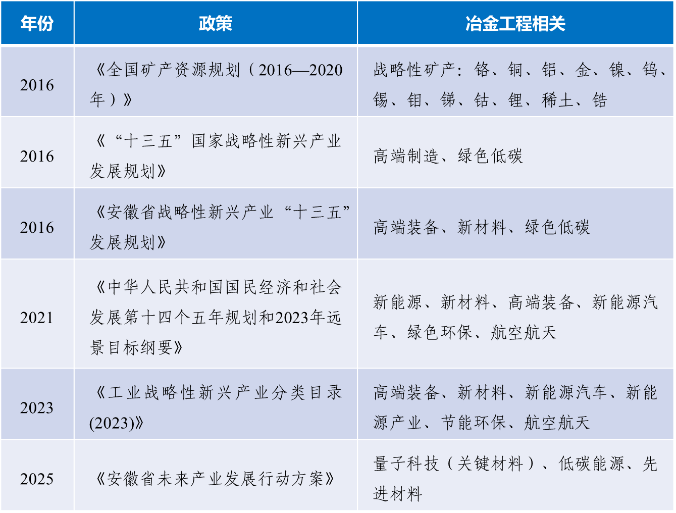 表1 近年来战略金属及其相关新兴产业领域政策