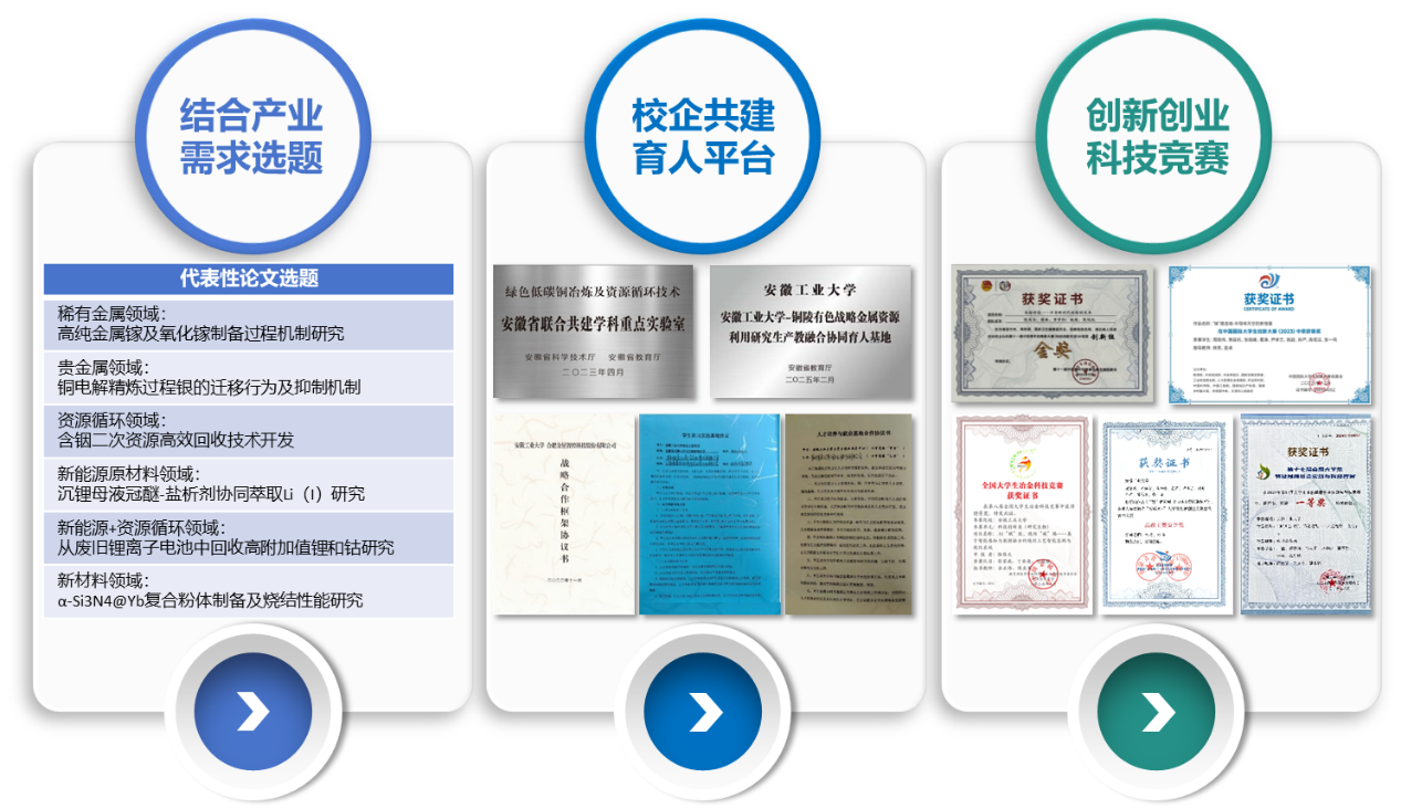 紧密结合产业需求,有效打通学术研究与产业应用之间的壁垒(图5)。一是创建需求导向、校企融通的科研育人模式,动态更新战略金属与新兴产业关键技术难题库,作为研究生选题主要来源,确保研究方向紧贴产业痛点与科学发展趋势。二是与行业龙头企业共建联合实验室/工程中心/实习基地,系统性打造高水平实践平台,为提升研究生解决复杂工程问题的能力提供有力载体。研究生积极参与企业重大攻关项目,与企业专家深度交流,在真问题、真场景中锤炼能力。三是研究生积极参与创新创业科技竞赛活动,作品中同时体现科技创新与市场思维,完成技术可行性验证与市场转化路径设计,体现研究生科学研究成效和成果转化价值。