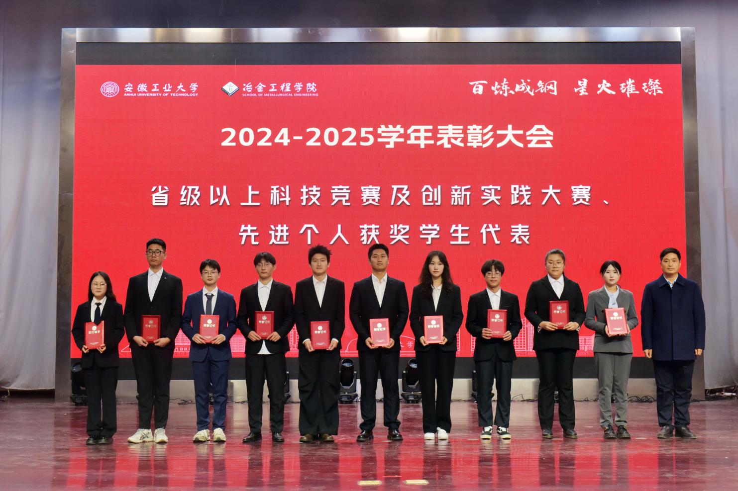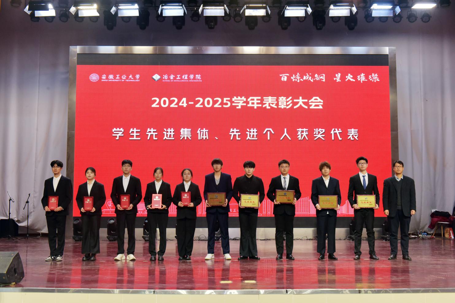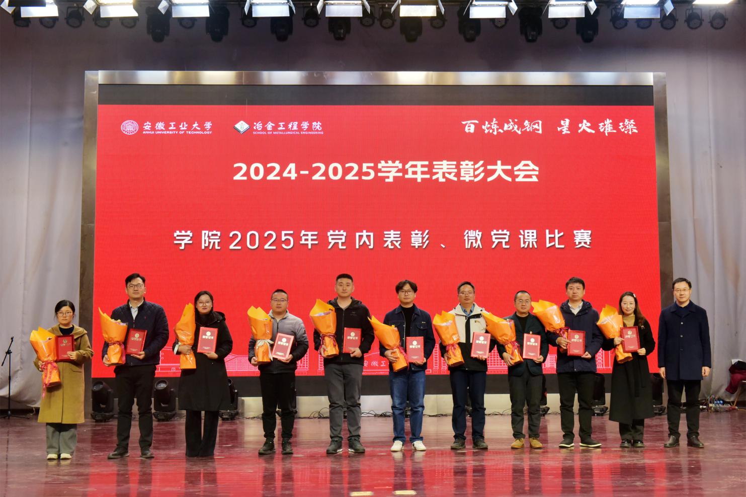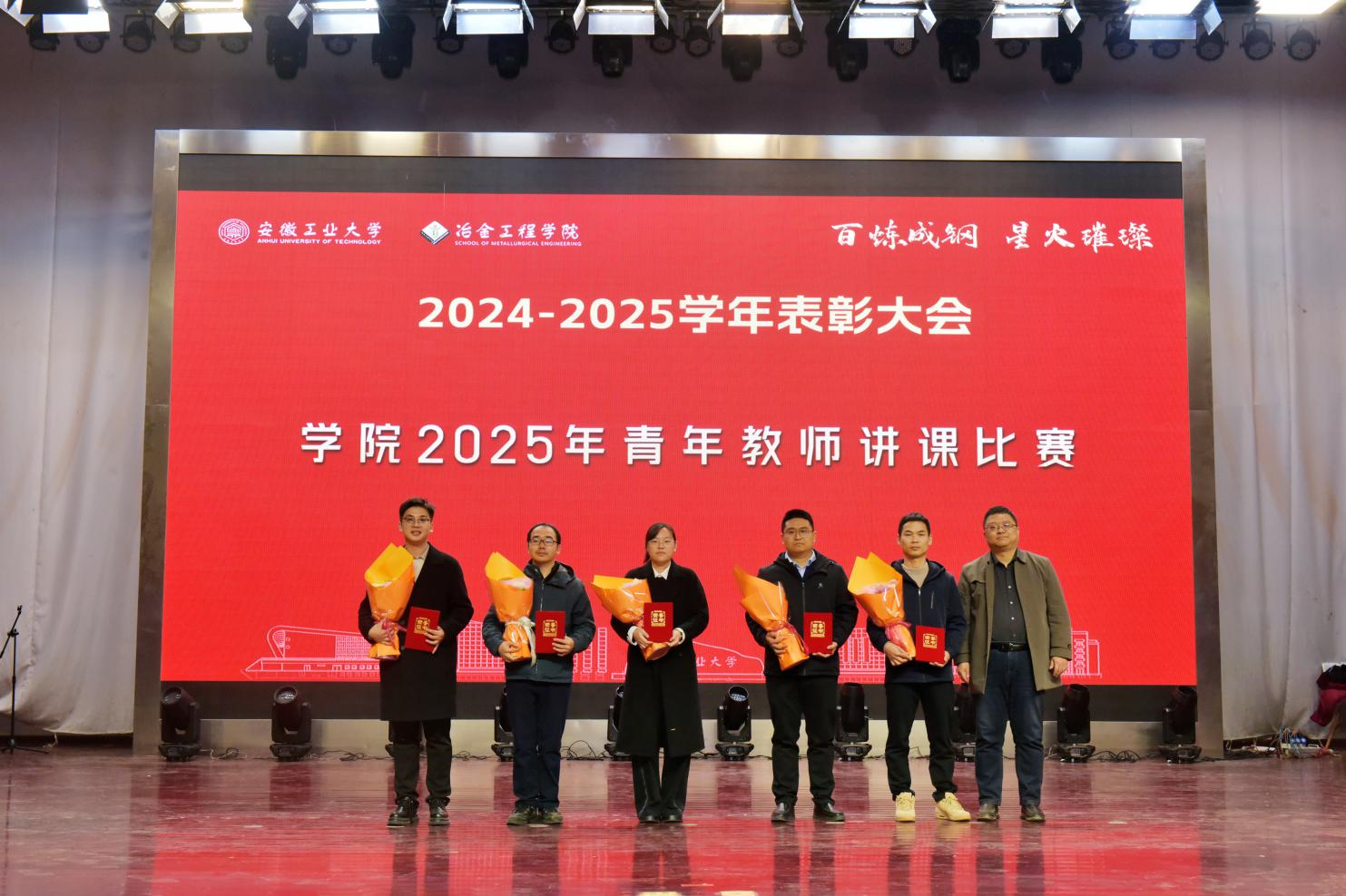 党委书记路壮志宣读了表彰通报。校先进班级型223班的黄诗云、张天乐讲述了班级建设的事迹与成果;国家奖学金获得者、冶243班汪静萱分享了从懵懂新生蜕变为专业第一的成长感悟;获奖教师代表、冶金工程系钱立新深情回顾了自己坚守育人初心的奋斗经历。与会领导为获奖先进集体和个人颁发了荣誉证书,学生代表向获奖老师献花致敬。