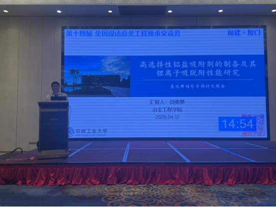 会议汇聚了国内外高校、科研院所及冶金企业的专家学者与技术骨干,围绕湿法冶金新工艺新装备、稀有与能源金属提取分离、固废资源化、清洁生产与过程强化等行业关键议题展开深入交流与研讨。田勇攀老师作了题为“高选择性铝盐吸附剂的制备及其锂离子吸脱附性能研究”的报告,系统介绍了关于高选择性铝盐吸附材料的制备及分离性能的最新研究进展。