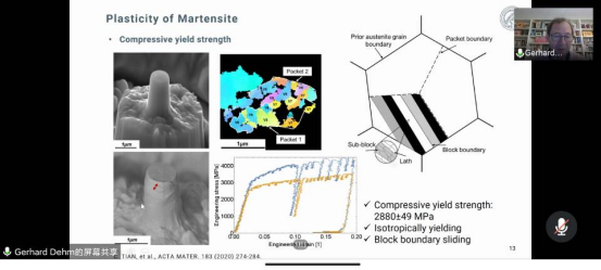 以及微纳组织与力学研究所(IMM)的相关情况,并向参会人员介绍了Gerhard Dehm教授的学术成就。然后,Dehm教授介绍了马克斯·普朗克钢铁研究所以及材料微观组织与微纳机械部门相关研究工作,并作题为“Probing the local influence of materials’ nanostructure on mechanical properties”的学术报告。 报告详细讲述了通过先进的原位微纳机械测试技术研究钢铁材料相、晶界和氢脆力学行为的最新进展。