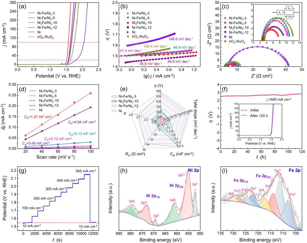 析氧(OER)过程中,精确调控电子构型与合理设计催化材料表面形态对提升电催化效率至关重要。研究团队通过一步熔盐电沉积方法,同步调控电子构型与微观结构形态,成功制备出富含缺陷的多孔Fe-Ni合金电极。通过控制Fe-Ni合金的原位电化学生长形成多孔通道,同时借助应变释放机制引入位错与孪晶缺陷。电极表面丰富的多孔通道为反应提供了丰富的活性位点,并促进气泡及时释放。同时,缺陷诱导的局部晶格应变优化了Ni的d带中心,平衡了中间体的吸附/脱附能,使其在碱性条件下展现出优异的OER性能,表现为低至265 mV的过电位和500 mA·cm-2大电流密度下超过120小时的稳定运行寿命。本研究通过形态结构与缺陷配置的双重优化,性能可比肩贵金属催化剂,为开发高效氧析出催化剂提供了新路径。