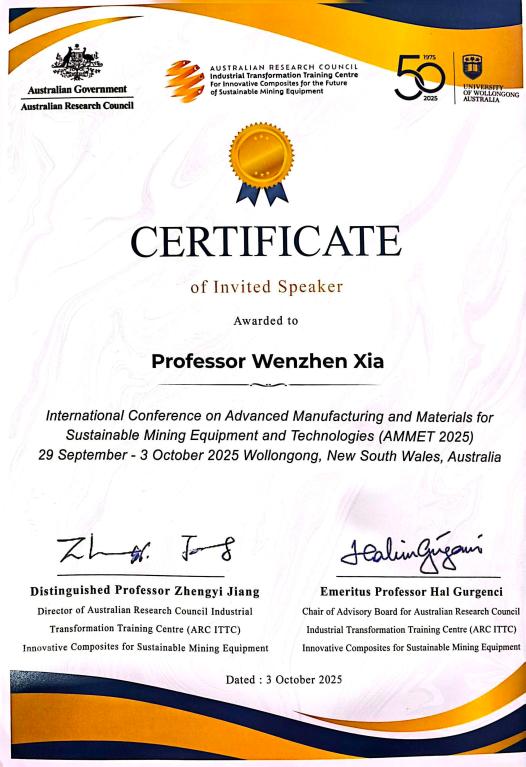 近日,四川麻将游戏 夏文真教授应邀赴澳大利亚伍伦贡,参加“2025年可持续采矿设备与技术的先进制造与材料国际会议(AMMET 2025)”。本次大会由澳大利亚研究委员会工业转型培训中心——“面向可持续采矿设备未来的创新复合材料中心”主办,汇聚了来自全球百余位专家学者,围绕先进材料制造、人工智能在矿业中的应用、绿色采矿技术等前沿主题展开了深入研讨与交流。