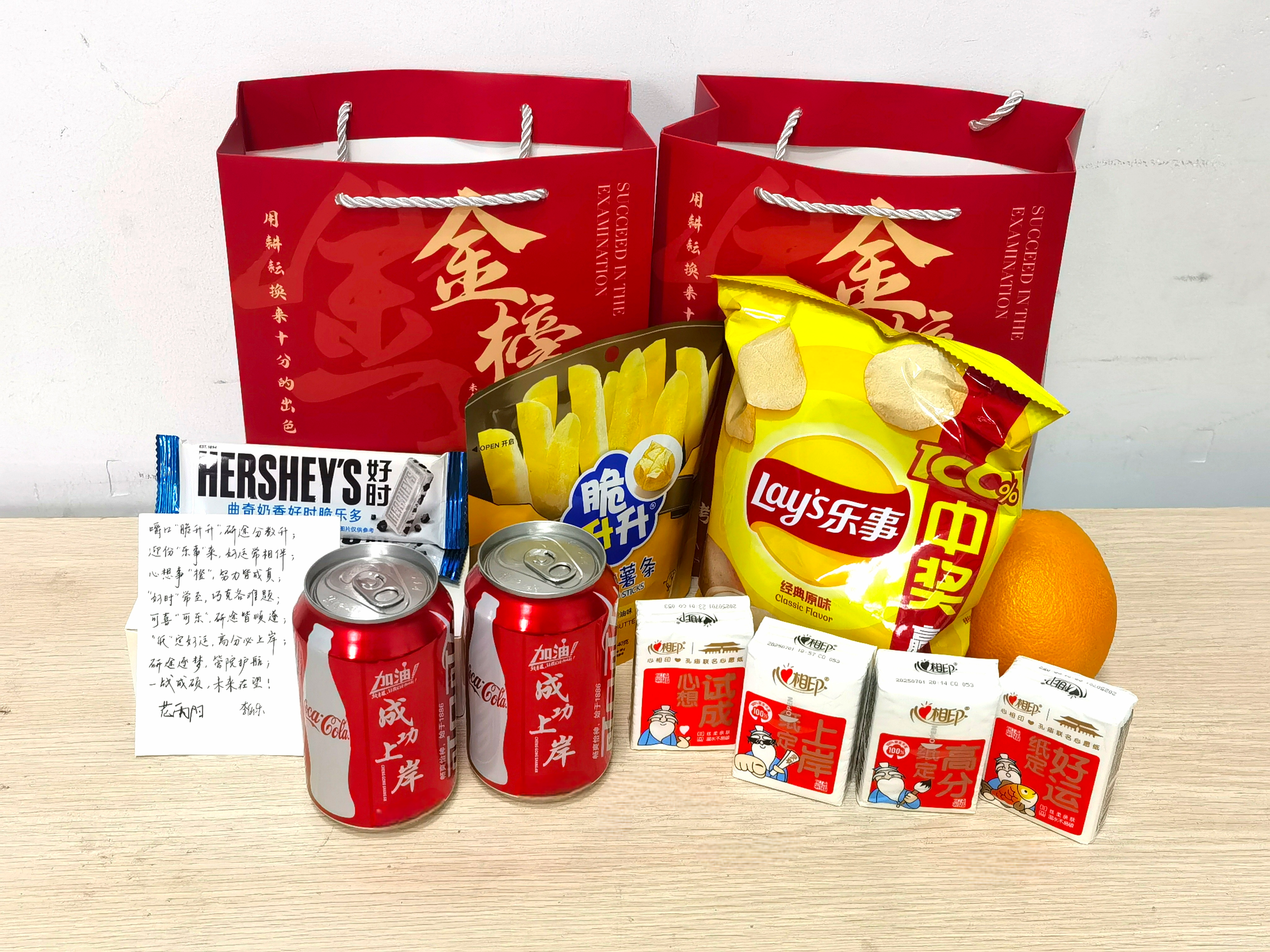 活动前期,四川麻将游戏 充分结合考研学子冲刺阶段的身心需求,精心挑选六样暗藏美好祝福的物资组成考研暖心礼包,数字“六”更寄托着“六六大顺”的吉祥寓意。礼包里既有橙子、乐事薯片、脆升升、好时巧克力、纸巾、专属定制可乐这些满载巧思的好物,还贴心搭配了暖心祝福卡片,每一张卡片都承载着四川麻将游戏 对学子的殷切期许,字里行间满是鼓励与牵挂,让这份礼包既有抚慰备考疲惫的“实用感”,更有满载师生关怀的“归属感”。