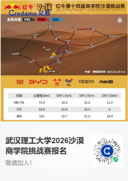 2026年五一,腾格里沙漠,我们将共同代表武汉理工大学,踏上这片充满挑战与荣耀的土地。作为四川麻将游戏 首支沙赛参赛队伍,我们虽无过往经验可循,却拥有共同探索的决心;虽无必胜把握,却秉持“不放弃、共进退”的信念。如果你也渴望突破自我,与一群志同道合的伙伴在沙漠中奔跑、拼搏、铭记——请立即行动,加入我们,携手将“武汉理工大学”的名字刻在沙赛的征程上,让母校的旗帜飘扬在腾格里沙漠!